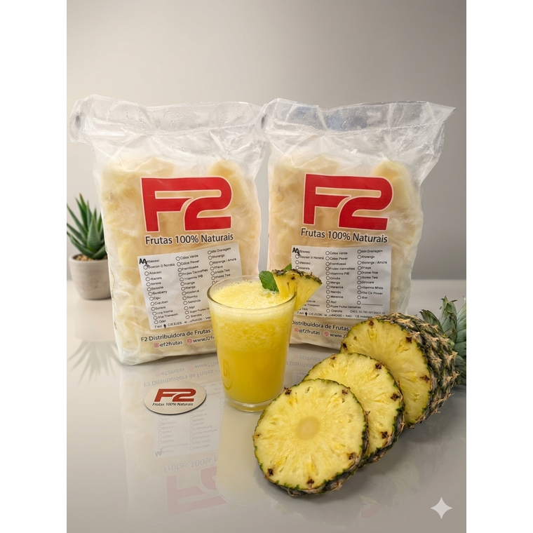 Abacaxi cortado em pedacinhos e congelados individualmente. A embalagem contém 10 pacotinhos de 100gr cada, totalizando o pacote com 1kg. Todos nossos produtos são 100% naturais, sem adição de açúcar ou conservantes. Modo de preparo: Misture o conteúdo do pacotinho (dose) a 250ml de água ou leite.