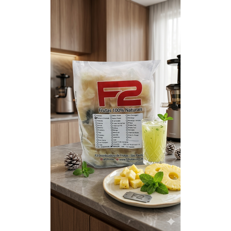 Abacaxi cortado em pedacinhos com algumas folhinhas de hortelã e congelados individualmente. A embalagem contém 10 pacotinhos de 100gr cada, totalizando o pacote com 1kg. Todos nossos produtos são 100% naturais, sem adição de açúcar ou conservantes. Modo de preparo: Misture o conteúdo do pacotinho (dose) a 350ml de água ou leite.