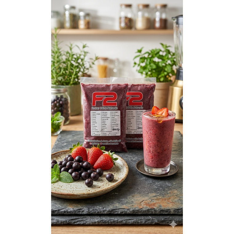O Kit contém 5 pacotinhos de 200gr cada de açaí 100% puro com pedacinhos inteiros de morango, totalizando o pacote com 1kg.