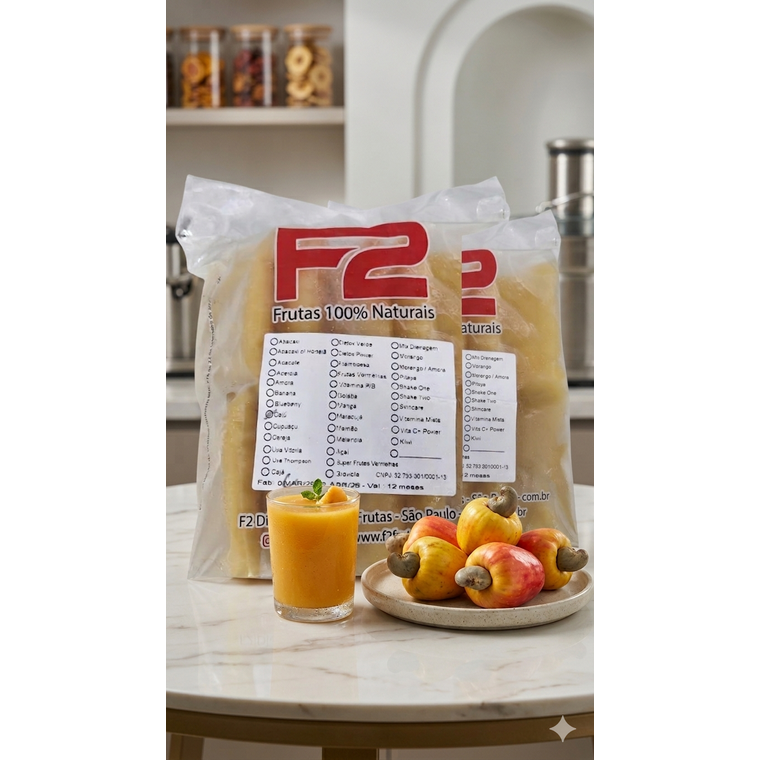 Polpa de Caju Concentrado. A embalagem contém 10 pacotinhos de 100gr cada, totalizando o pacote com 1kg. Todos nossos produtos são 100% naturais, sem adição de açúcar ou conservantes. Modo de preparo: Misture o conteúdo do pacotinho (dose) a 350ml de água ou leite.