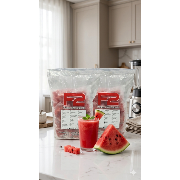 Melancia cortada em pedacinhos e congeladas individualmente. A embalagem contém 5 pacotinhos de 200gr cada, totalizando o pacote com 1kg. Todos nossos produtos são 100% naturais, sem adição de açúcar ou conservantes. Modo de preparo: Misture o conteúdo do pacotinho (dose) a 350ml de água ou leite.