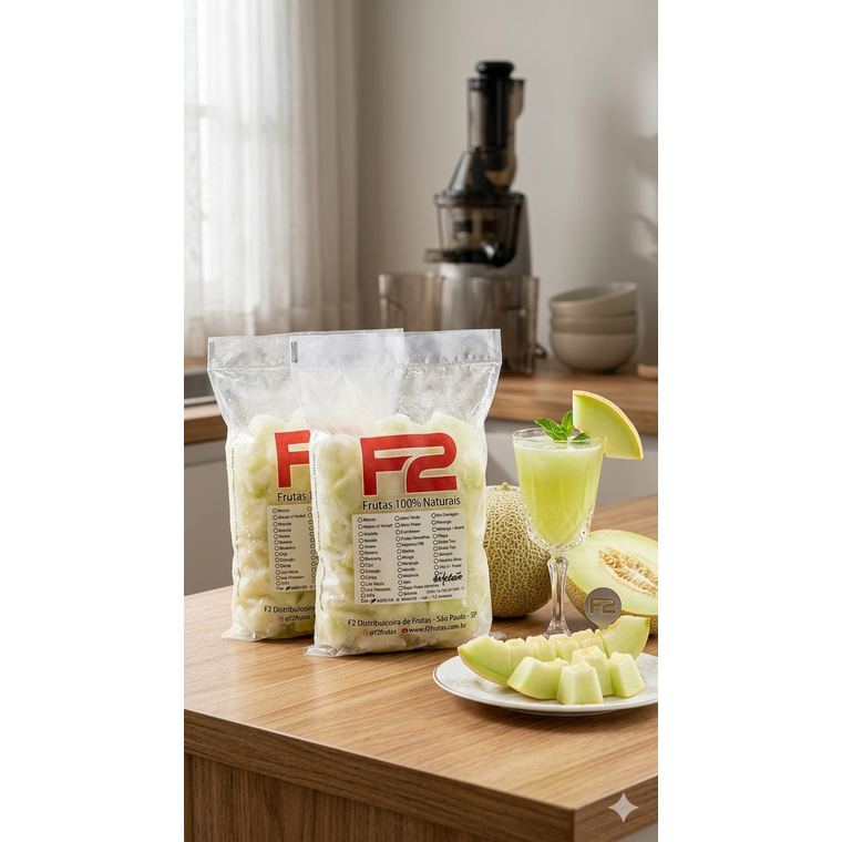 Melão cortado em pedacinhos e congelados individualmente. A embalagem contém 5 pacotinhos de 200gr cada, totalizando o pacote com 1kg. Todos nossos produtos são 100% naturais, sem adição de açúcar ou conservantes. Modo de preparo: Misture o conteúdo do pacotinho (dose) a 250ml de água ou leite.