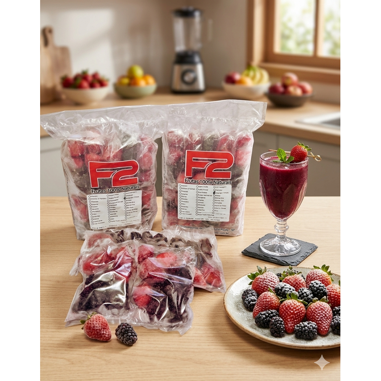 Morango e Amoras inteiras e congeladas individualmente. A embalagem contém 10 pacotinhos de 100gr cada, totalizando o pacote com 1kg. Todos nossos produtos são 100% naturais, sem adição de açúcar ou conservantes. Modo de preparo: Misture o conteúdo do pacotinho (dose) a 350ml de água ou leite.