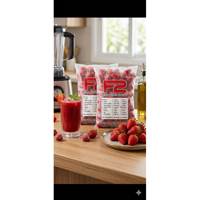Morangos inteiros e congelados individualmente. A embalagem contém 10 pacotinhos de 100gr cada, totalizando o pacote com 1kg. Todos nossos produtos são 100% naturais, sem adição de açúcar ou conservantes. Modo de preparo: Misture o conteúdo do pacotinho (dose) a 250ml de água ou leite.
